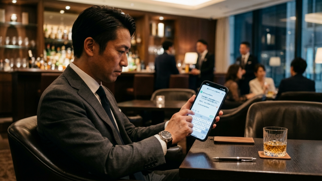 男性がギャラ飲みアプリを使う場合も、騒がしい場より、会話を楽しめる静かなお店、ホテルラウンジ、落ち着いたバーなどが選ばれやすい傾向があります。